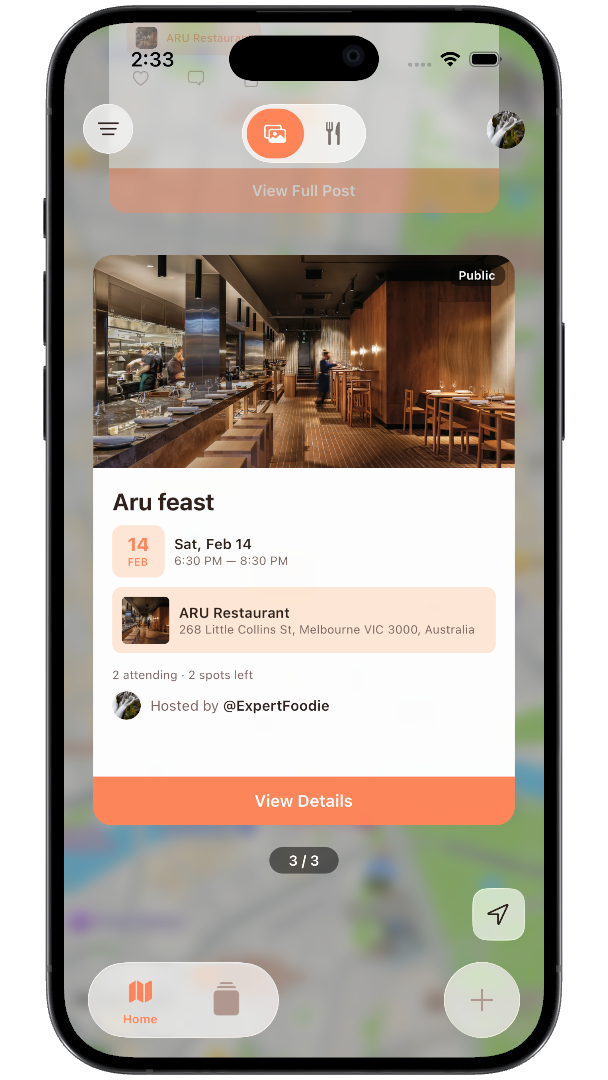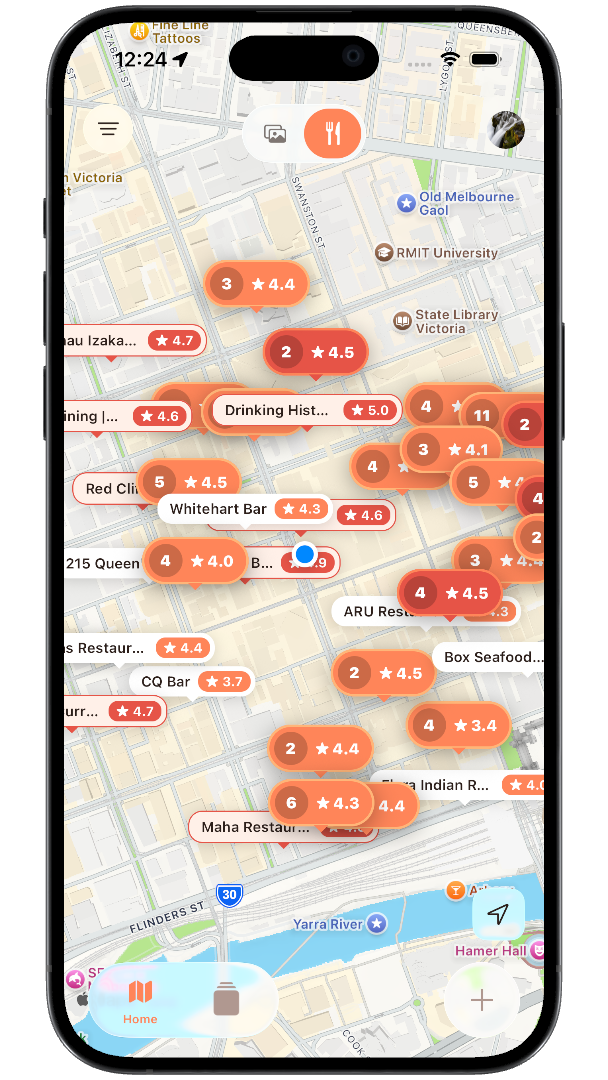 Discover restaurants and social dining moments on an interactive map. Toggle between restaurant ratings and social posts, filter by cuisine, and tap any marker for instant details.