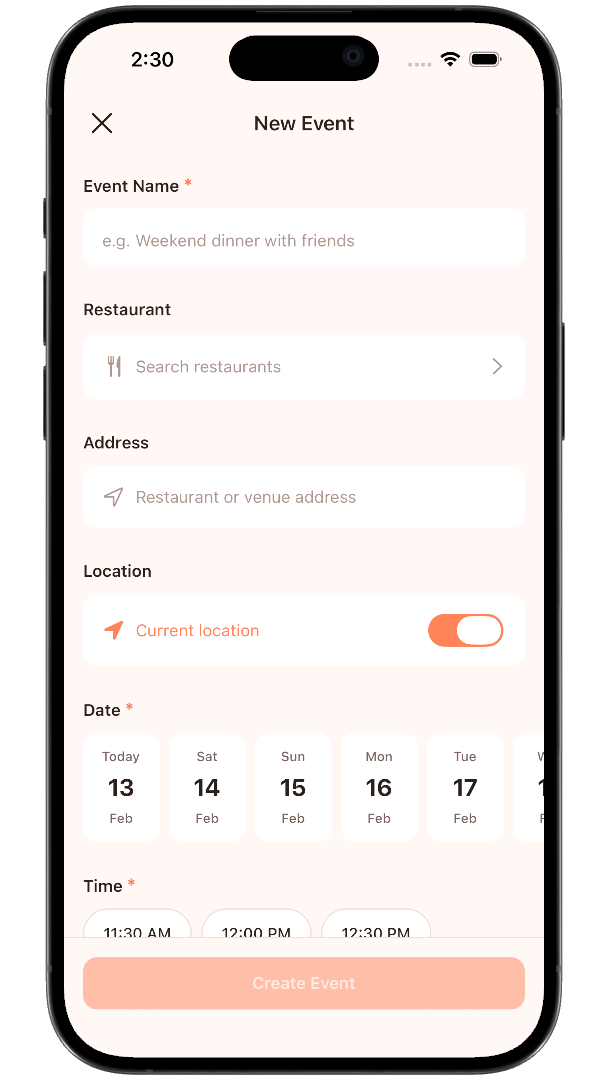 Create dining events and invite friends or open them to the community. Set the restaurant, date, party size, and payment style — then watch your table fill up.