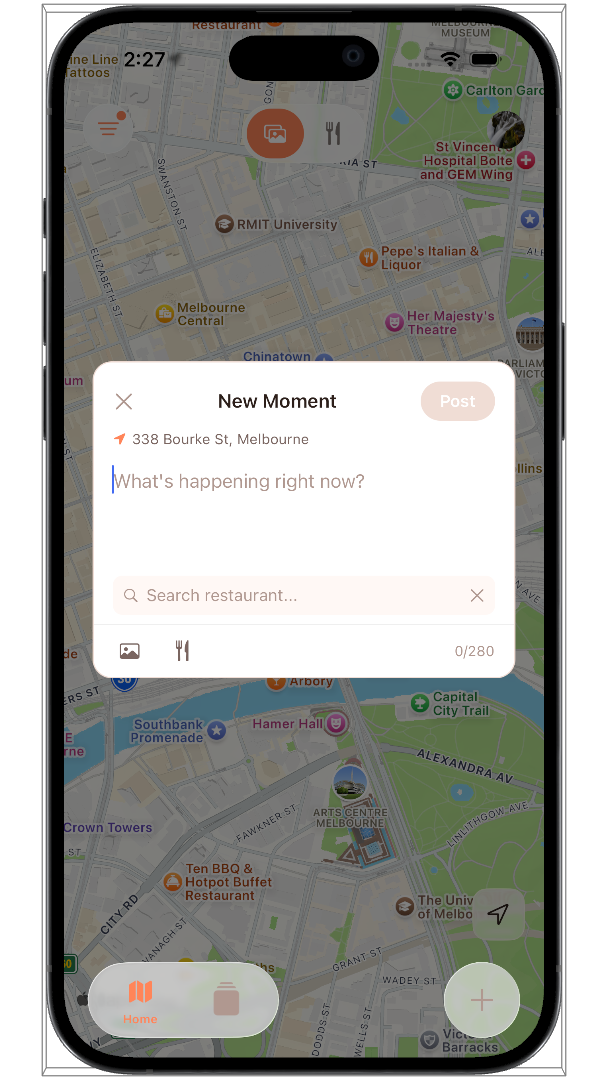 Share quick moments or detailed posts with photos, restaurant tags, and location pins.